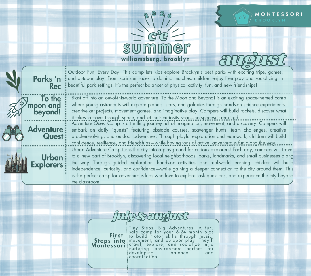 Come enjoy a summer amongst friends, parks and, the sun with us at C'E Montessori. Our offerings for summer camps this year center around being constantly outdoors, enjoying our neighborhood, picnicking in our green spaces and having a blast with friends. Children between 1 and 12 years old can now sign up and choose from different camp options.